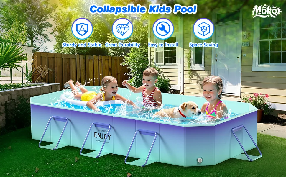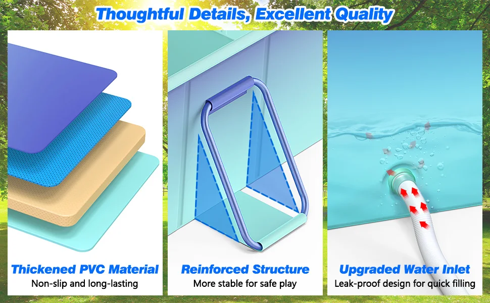 2. Stable and Non-Slip: The framed swimming pools are made of high grade PVC material with multiple layers to ensure sturdiness and durability for long term use. The upgraded steel tube support improves stability and the non-slip design on the bottom increases safety, allowing your family and pets to play safely in the pool.