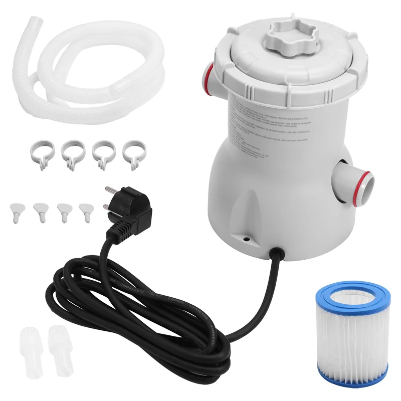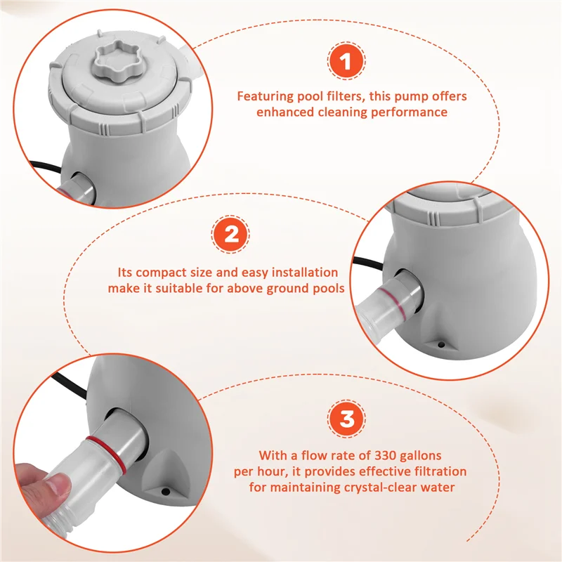 The Small Swimming Pool Filter Pump is designed to efficiently clean and filter pool water, ensuring a refreshing swimming experience. With a flow rate of 330 gallons per hour, it provides effective filtration for maintaining crystal-clear water
